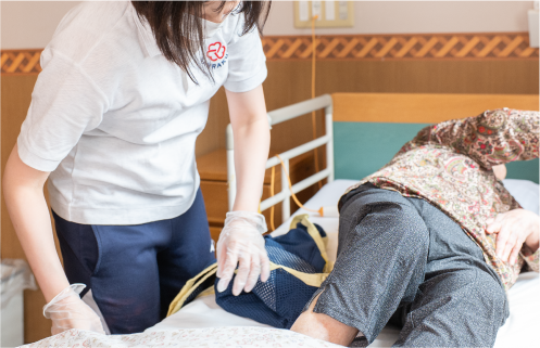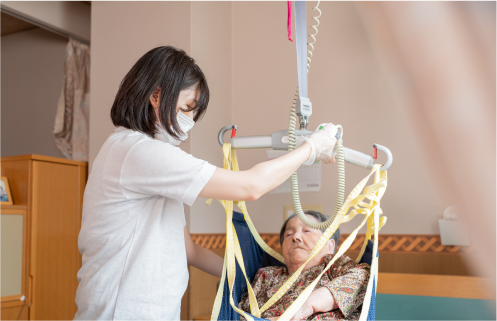 2015年より介護リフトの運用を開始しました。介護リフトはスリングシートという釣り具を使用し、ご利用者さまをベッドから車いすなどに移乗するための福祉機器です。介護職員にとって負担が少なく、入居者にとっても快適な移乗が可能です。
